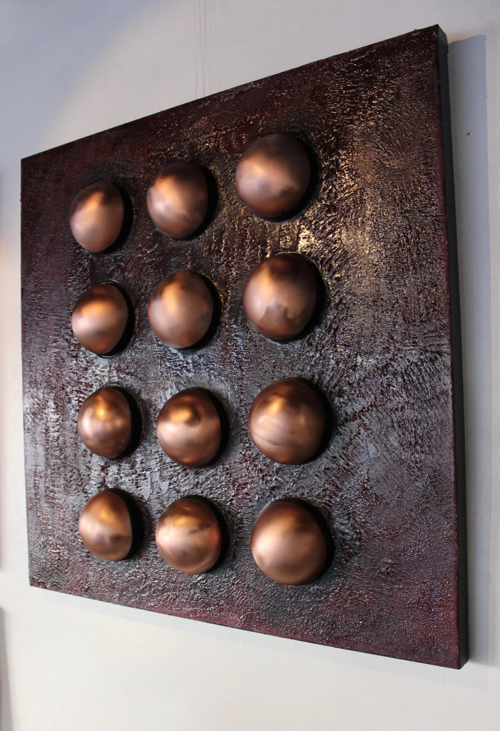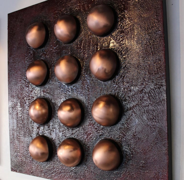 Metallic, chestnut-hued domes emerge from a richly textured ground, evoking autumn seeds embedded in earth and the quiet order of seasonal cycles.