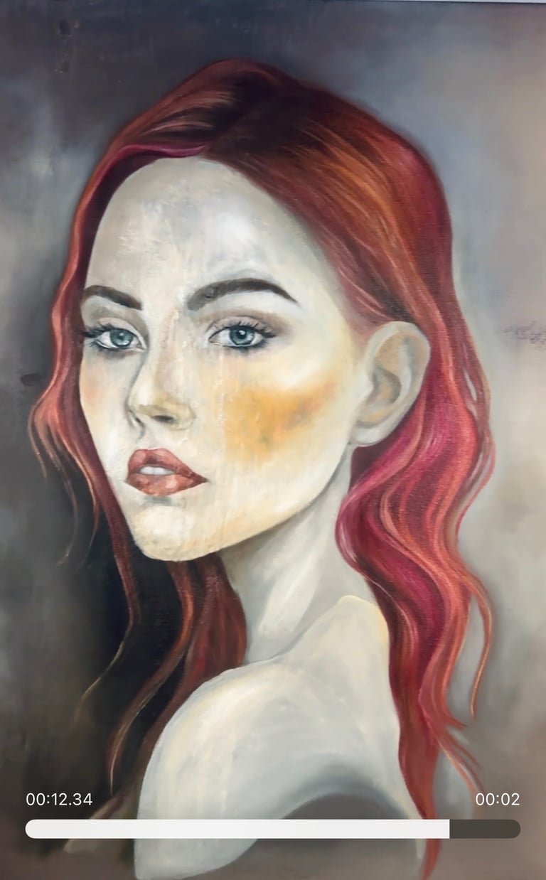 The portrait evokes the fleeting beauty of autumn. Her hair flows like falling leaves, golden light touches her skin. She turns her head in a quiet reflection embodying the warmth of what has passed and the inevitability of change yet to come.