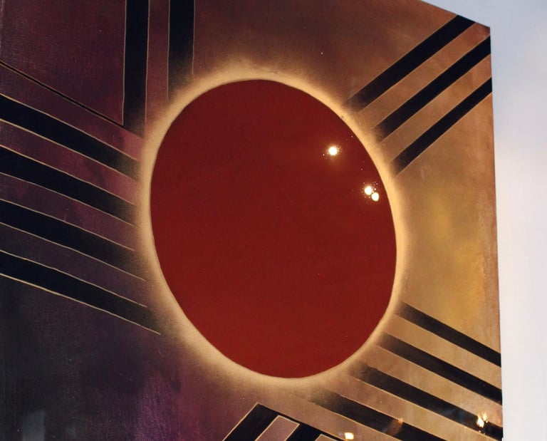 The composition blends elements of Art Deco geometry with cosmic symbolism, suggesting themes of power and cosmic alignment.